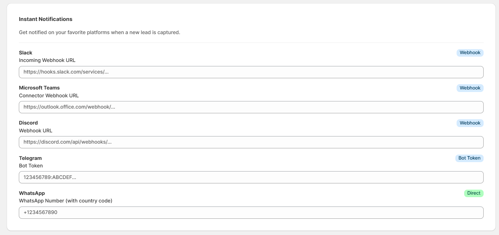 Add webhook URLs or tokens for platforms like Slack, Discord, Microsoft Teams, Telegram, or WhatsApp.