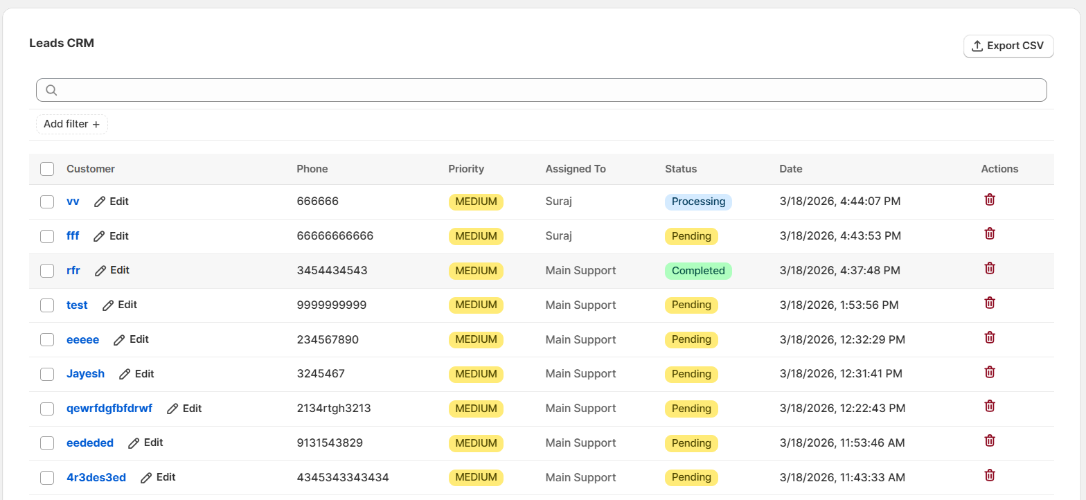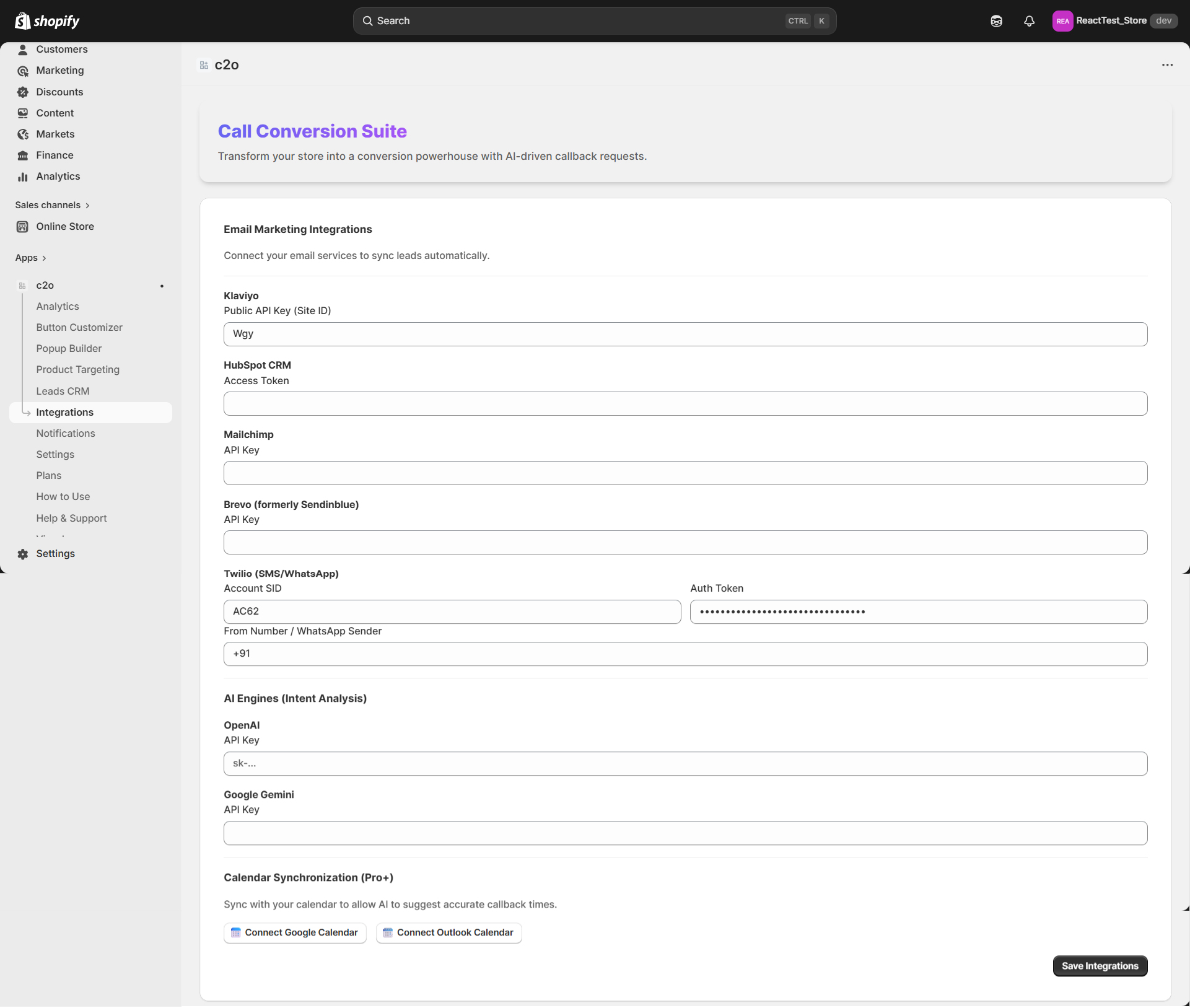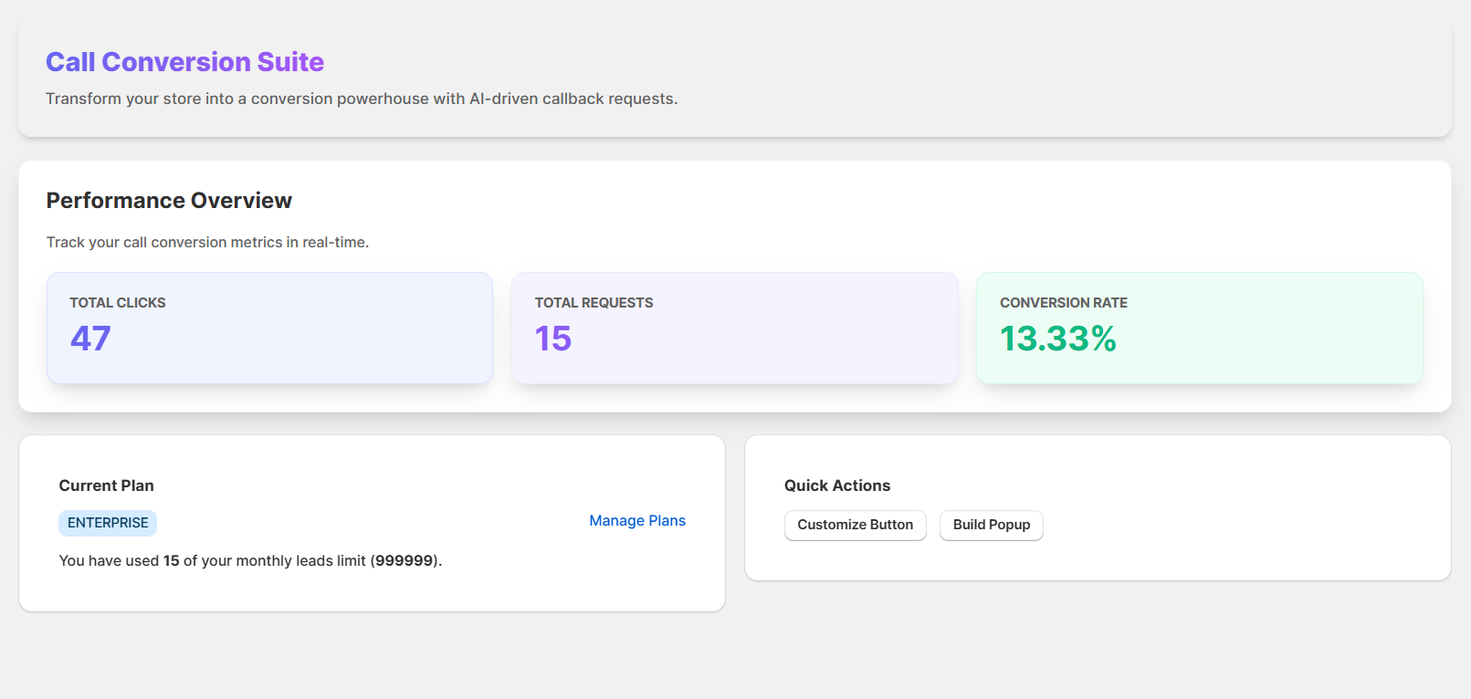 Call Conversion Suite helps you convert more visitors into customers by enabling instant callback requests on your store. Customers can request a call directly from product pages, and all leads are managed from a centralized dashboard with AI-powered insights to improve response and conversion rates.