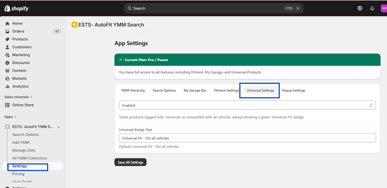 Universal Setting allows you to mark certain products as compatible with all vehicles.