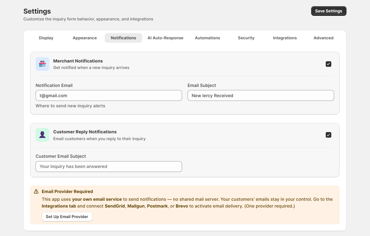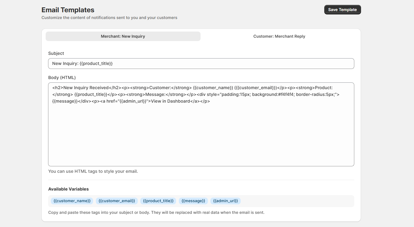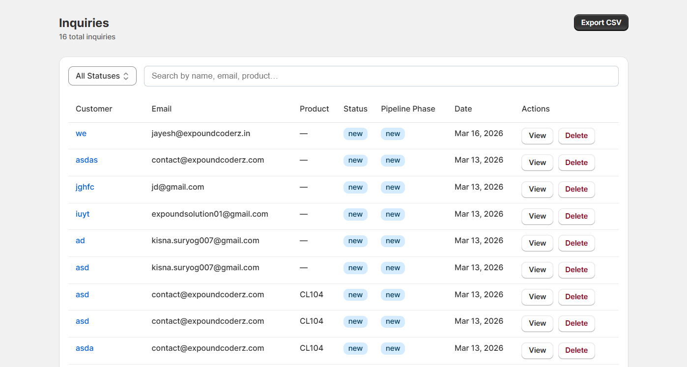 Whenever a customer submits an inquiry or quote request, the app can send email notifications to both the customer and the store admin. This ensures that inquiries are promptly addressed and no potential leads are missed.