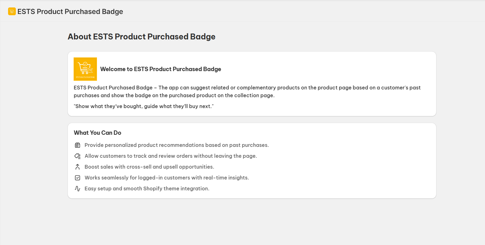 This app is created by ESTS (Expound Coderz). It is especially developed for those who want to integrate their Shopify store with the ESTS Product Purchased Badge.