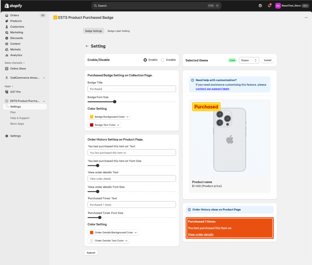 The app can suggest related or complementary products on the product page based on a customer's past purchases and show the badge on the purchased product in the collection page. This encourages cross-selling and upselling.