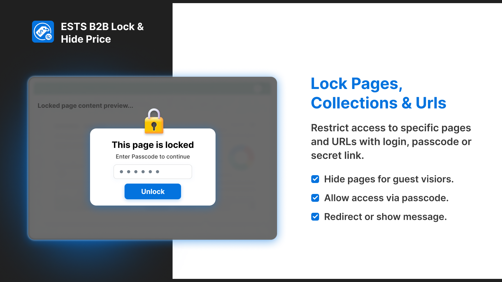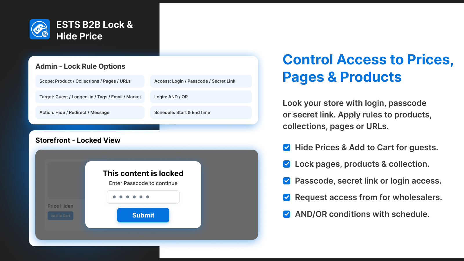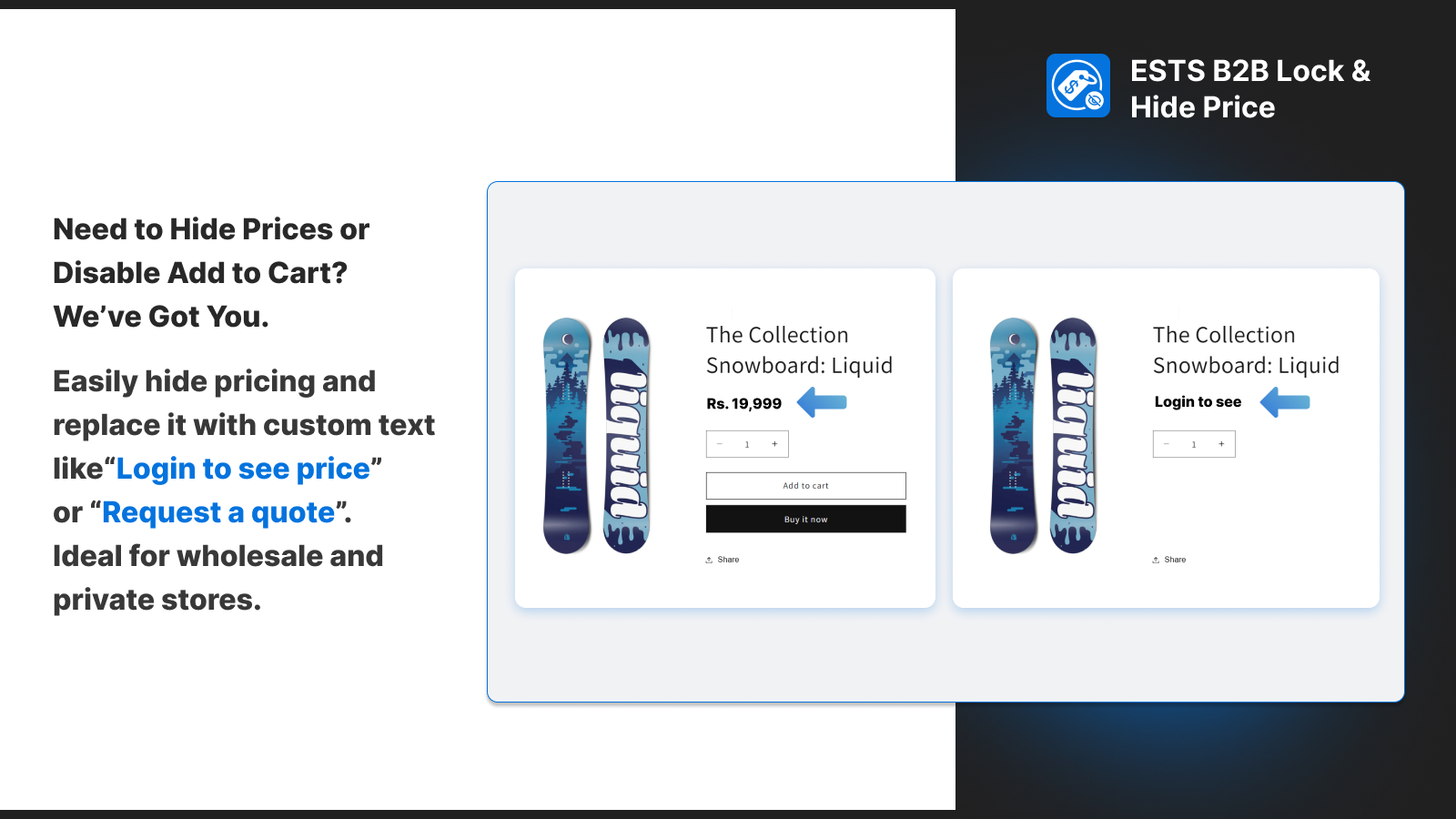 Welcome to the ESTS B2B Lock & Hide Price App, developed by ESTS (Expound Coderz). Our mission is to transform the user experience on your Shopify store. With the ESTS B2B Lock & Hide Price App, you can strategically hide product prices until users log in, fostering a sense of exclusivity and encouraging visitor engagement. We put you in control, allowing you to customize the message displayed in place of prices and manage this feature effortlessly from the admin panel.