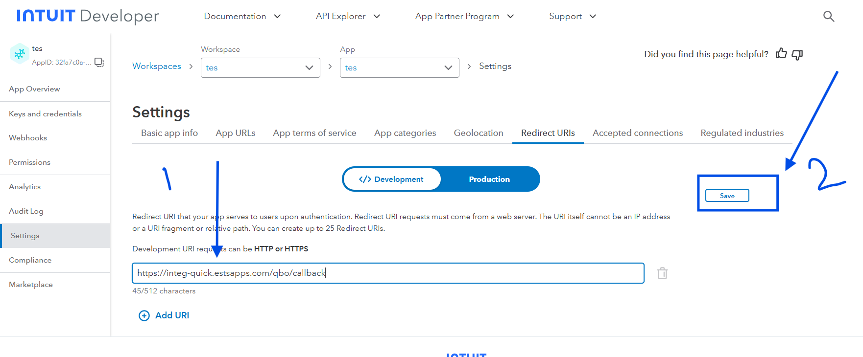 Now ensure your QuickBooks mode either Development or Production. Right now we are taking Development mode. Now Click on redirect URLs.
