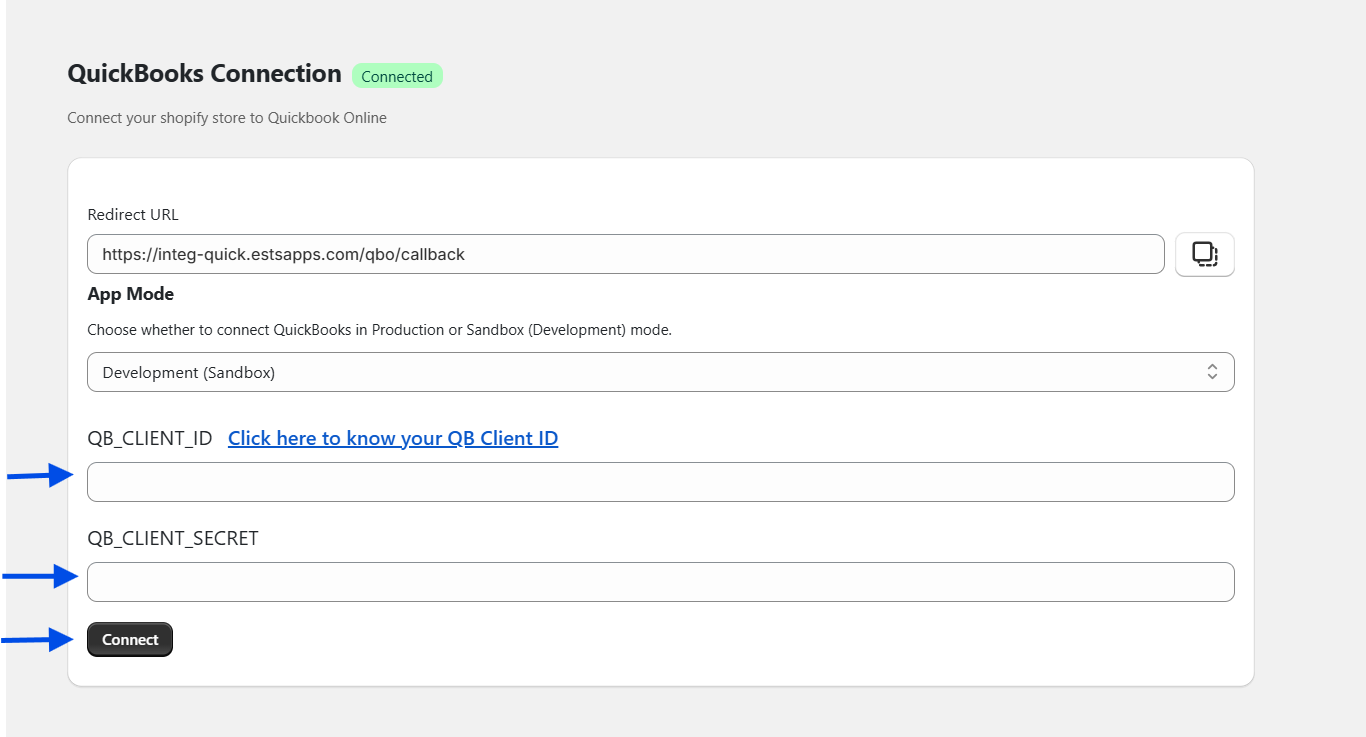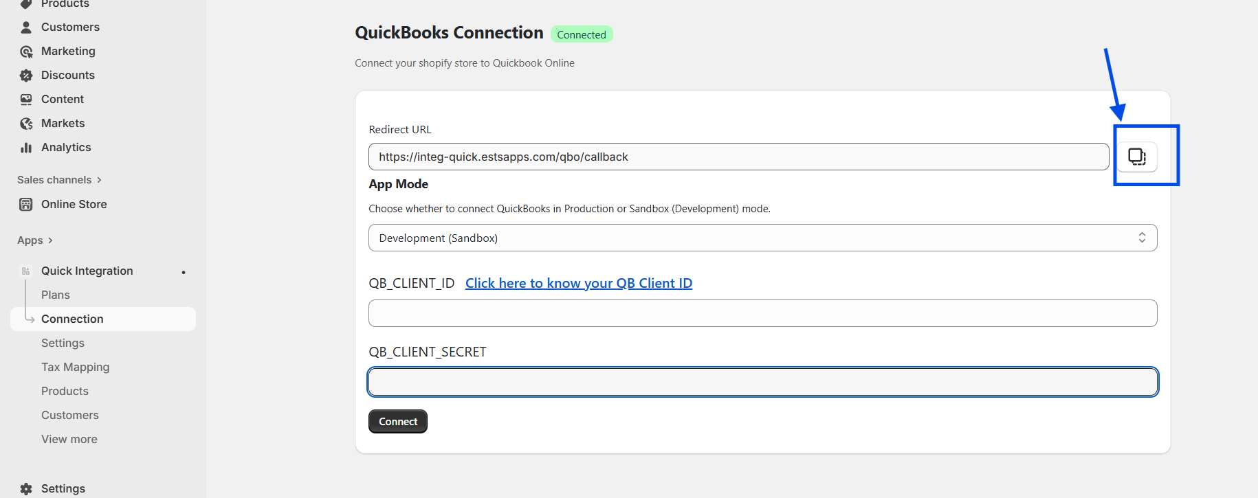 Now copy this client ID and Client Secret and paste in QuickBooks_CLIENT_ID , secret section respectively as shown in below image and click on "connect" button.