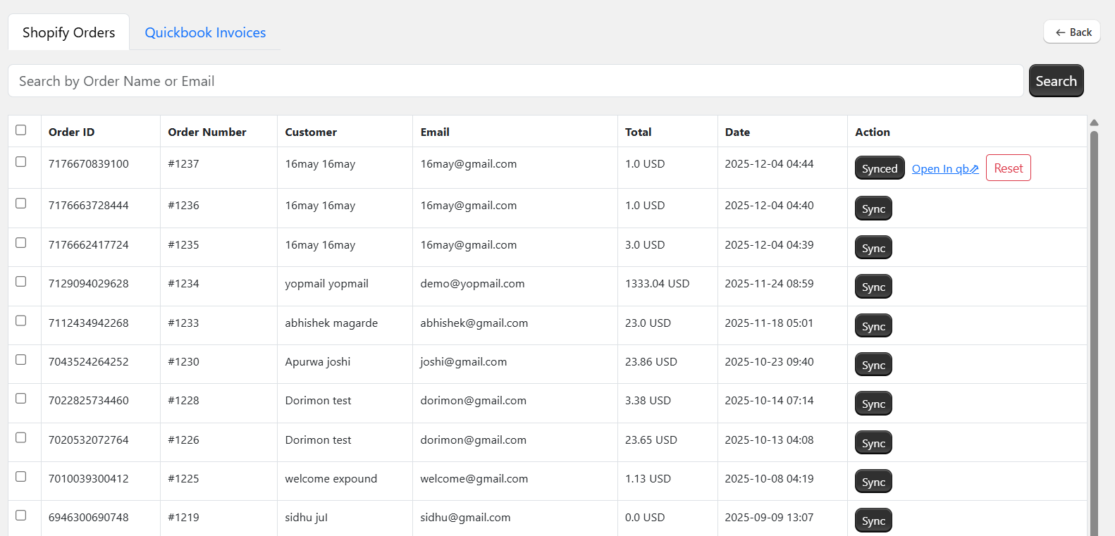 To sync Shopify order in QuickBooks, simply click on sync button. If you want to sync multiple order in QuickBooks, select the checkbox and click on button “Batch Sync” button. This button will only visible when u select one or more order.