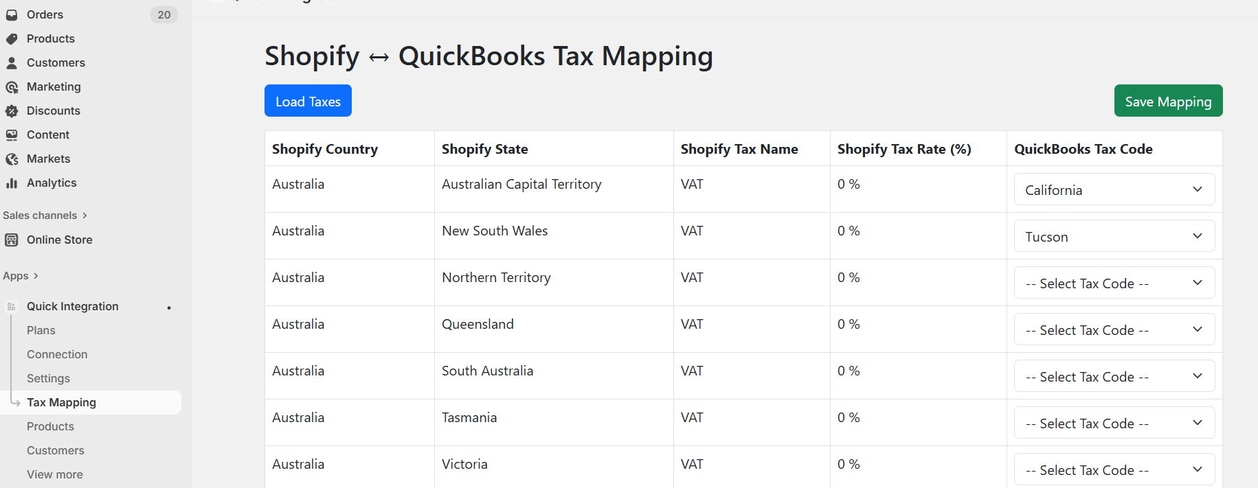 Now To setup Tax Mapping . Go to Tax Mapping page and map tax like this or according to your need. This setting will make effect when you export shopify order into QuickBooks .