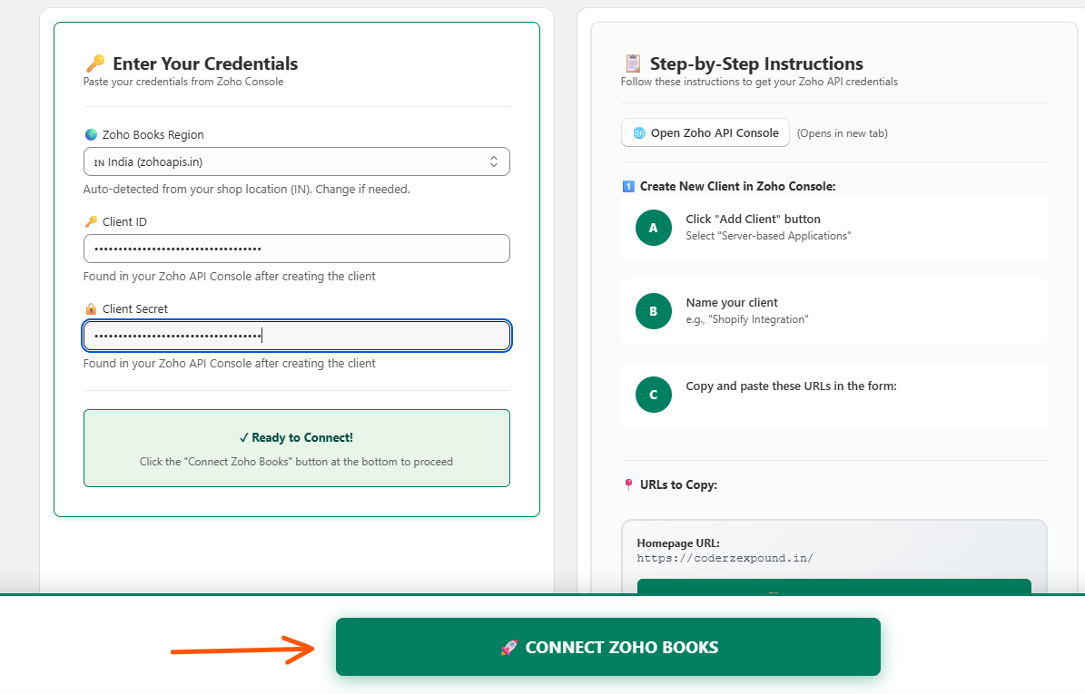 - Paste them into the respective Client ID and Client Secret fields on the Zoho Connect page.