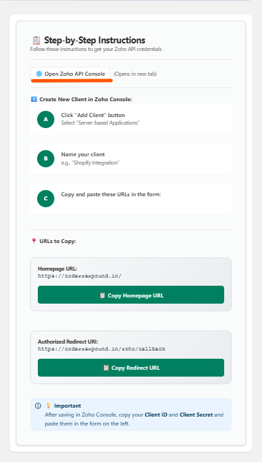 1. Click on Open Zoho API Console. This will open the Zoho API Console in a new browser tab.